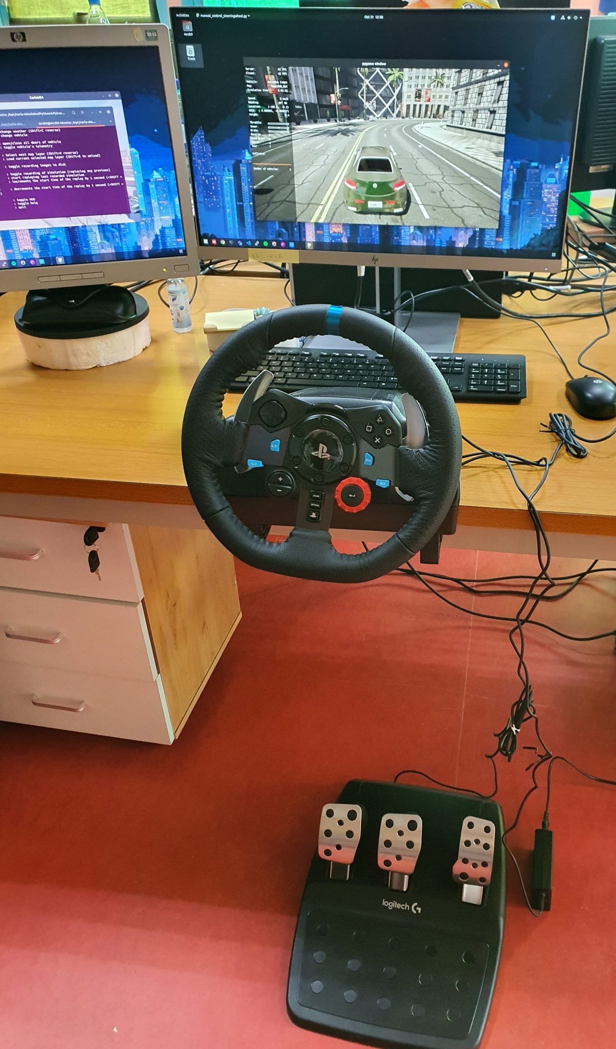 We have gotten the Logitech G920 steering wheel and pedal for our self-driving car project. It is much more natural to drive with the steering wheel and pedal than the keyboard and mouse. It works in Carla and will be used in the data collection phase. This will be Syamimi’s toy for a while.